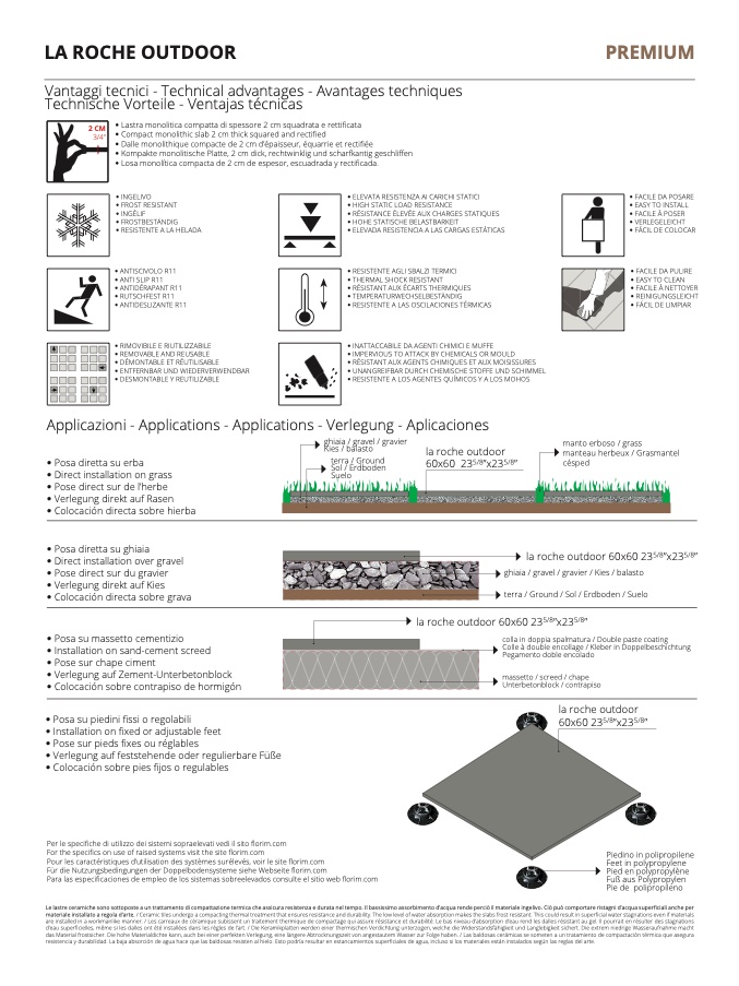 d’eau superficielles, même si les dalles ont été installées dans les règles de l’art. / Die Keramikplatten werden einer thermischen Verdichtung unterzogen, welche die Widerstandsfähigkeit und Langlebigkeit sichert. Die extrem niedrige Wasseraufnahme macht