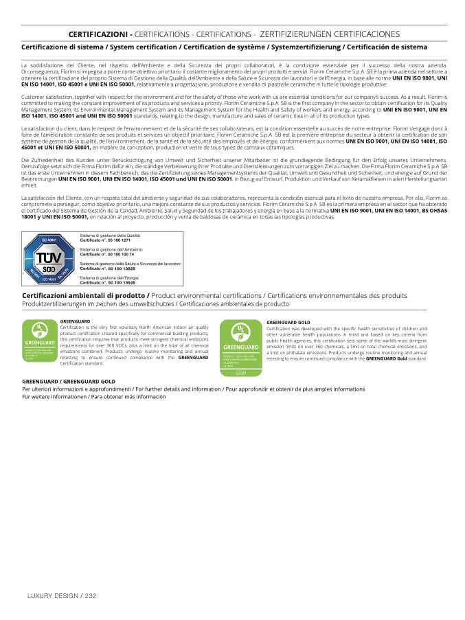 committed to making the constant improvement of its products and services a priority. Florim Ceramiche S.p.A SB is the first company in the sector to obtain certi