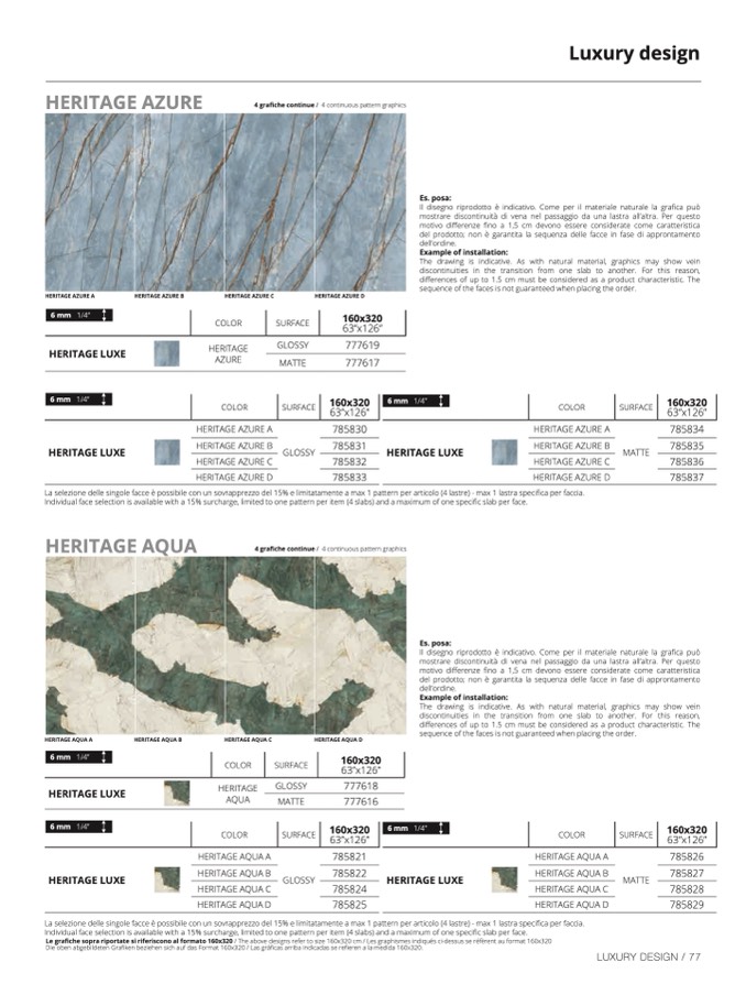 La selezione delle singole facce è possibile con un sovrapprezzo del 15% e limitatamente a max 1 pattern per articolo (4 lastre) - max 1 lastra specifica per faccia.