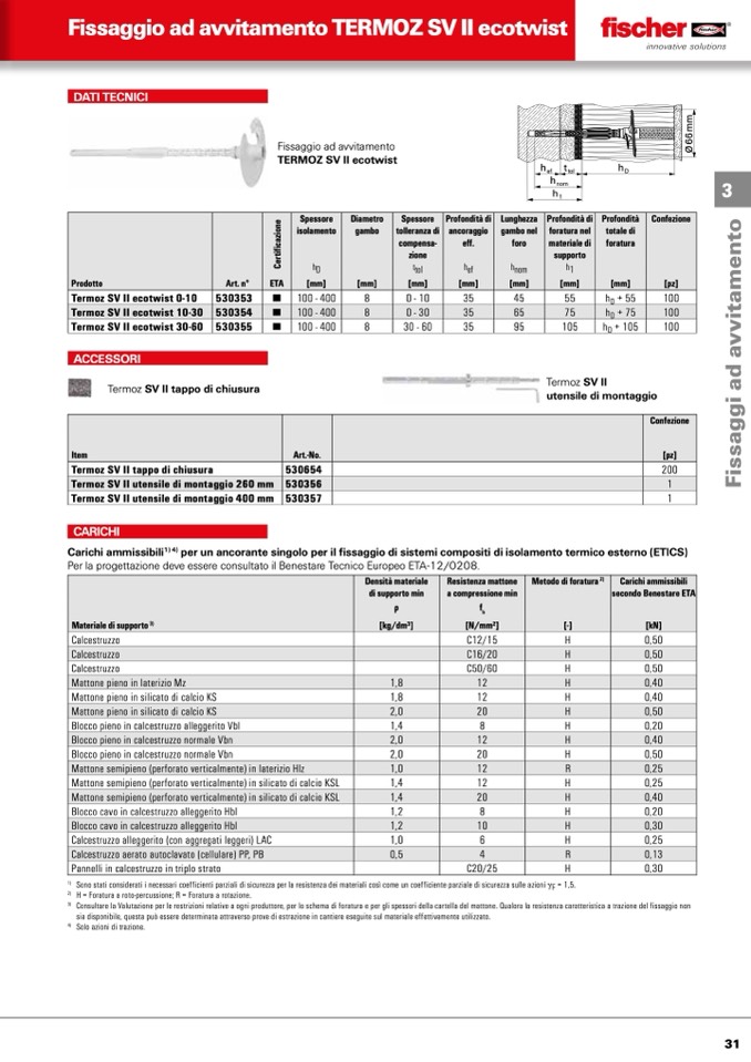 Consultare la Valutazione per le restrizioni relative a ogni produttore, per lo schema di foratura e per gli spessori della cartella del mattone. Qualora la resistenza caratteristica a trazione del fissaggio non