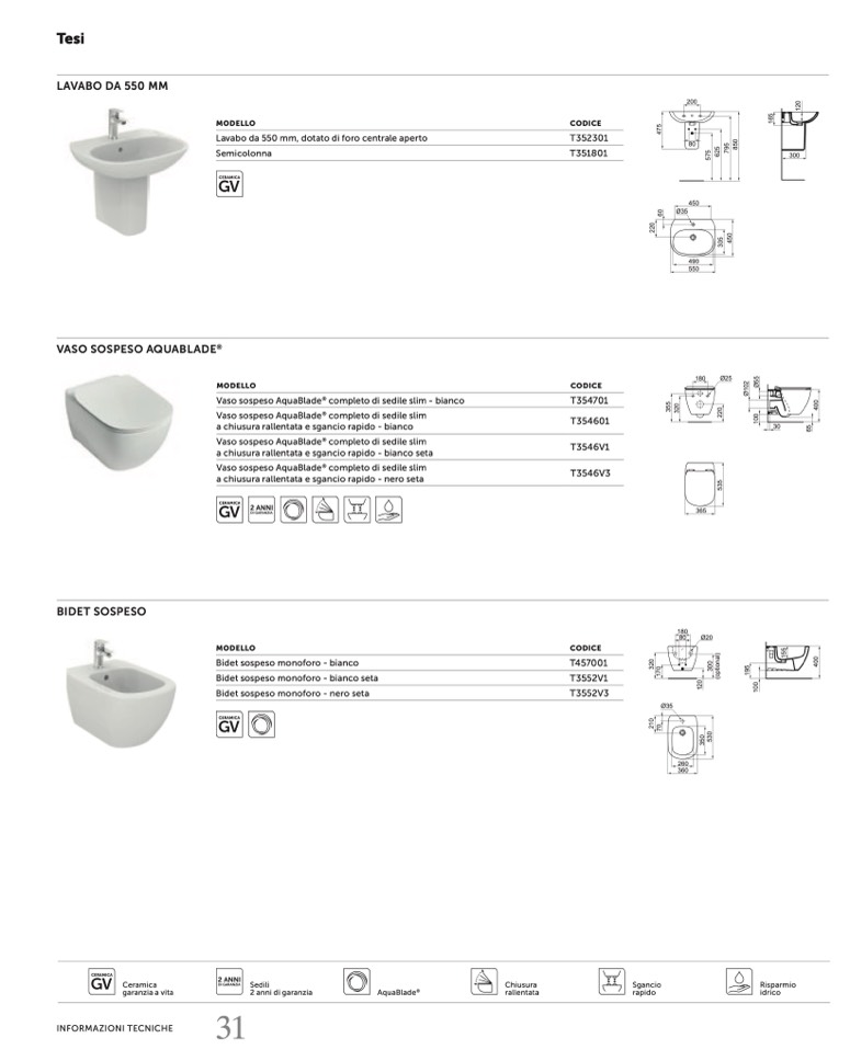 Lavabo da 550 mm, dotato di foro centrale aperto