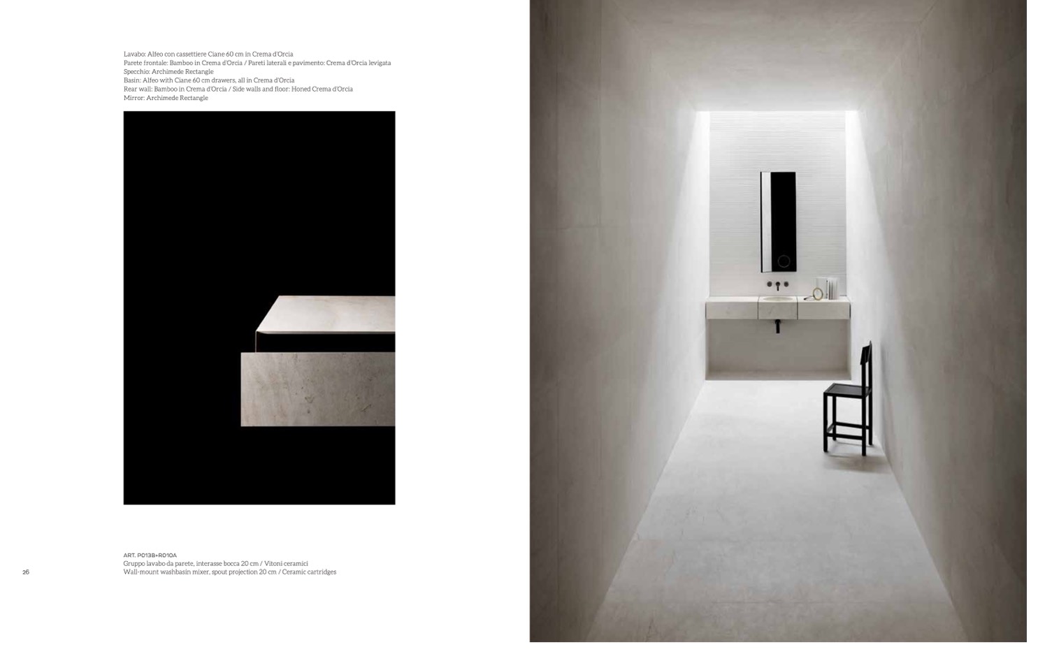 Parete frontale: Bamboo in Crema d’Orcia / Pareti laterali e pavimento: Crema d’Orcia levigata