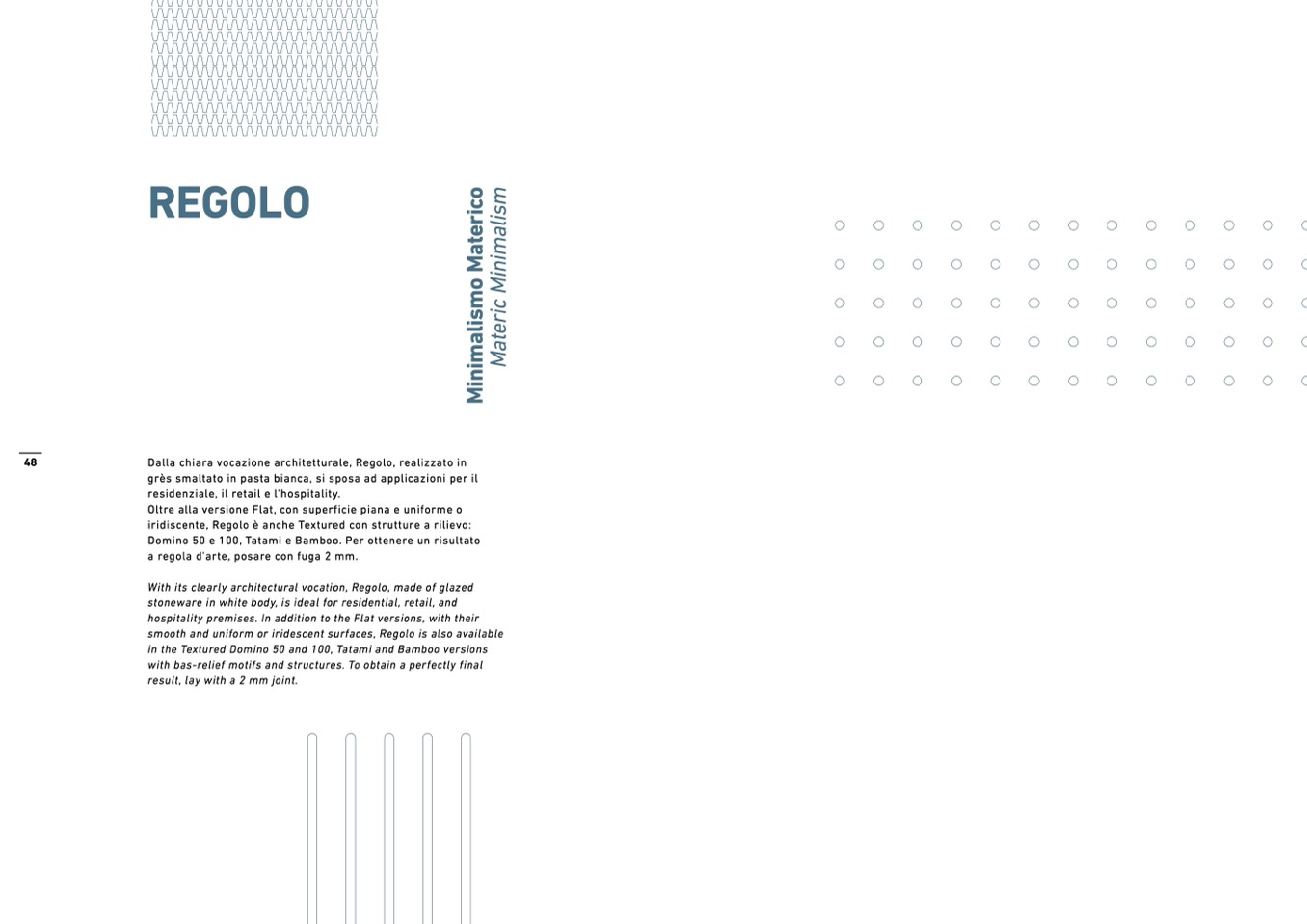 smooth and uniform or iridescent surfaces, Regolo is also available