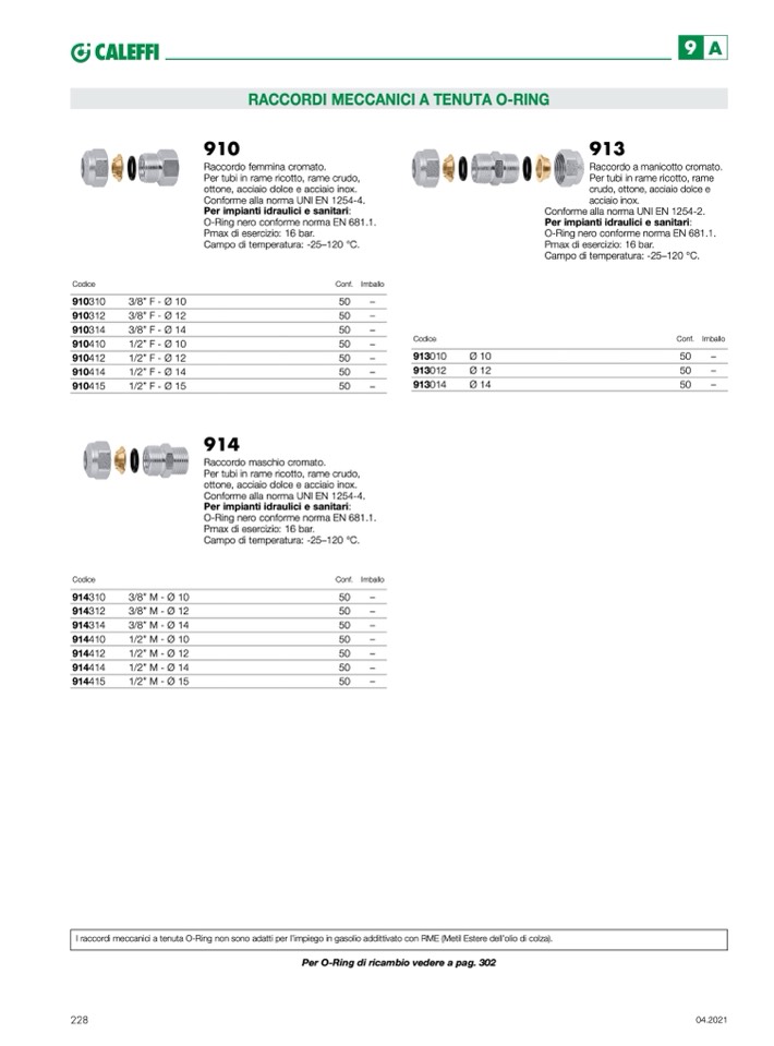 I raccordi meccanici a tenuta O-Ring non sono adatti per l’impiego in gasolio addittivato con RME (Metil Estere dell’olio di colza).