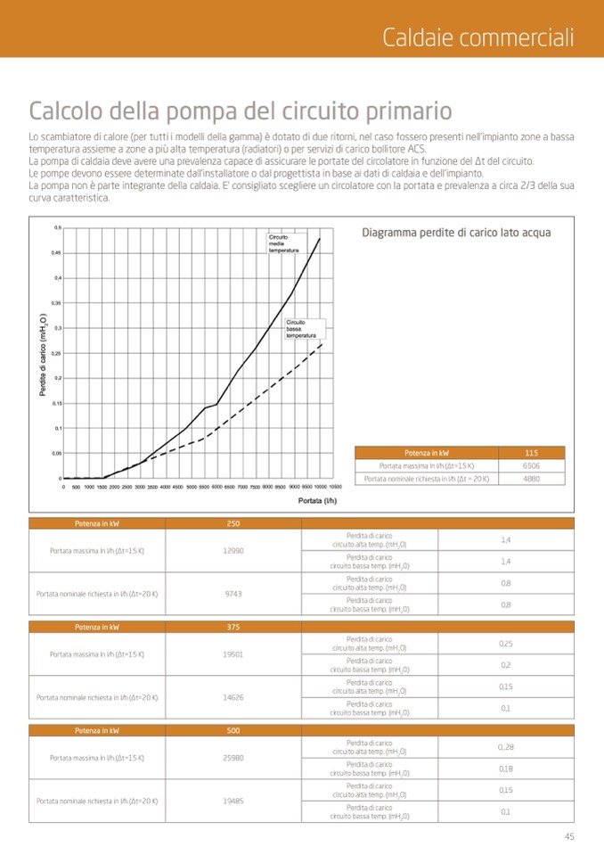 La pompa di caldaia deve avere una prevalenza capace di assicurare le portate del circolatore in funzione del ∆t del circuito.