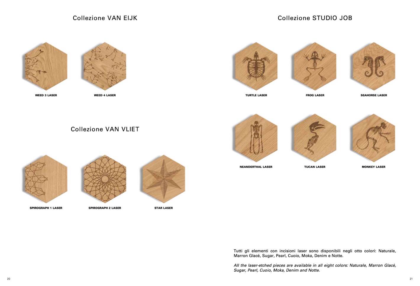 Tutti gli elementi con incisioni laser sono disponibili negli otto colori: Naturale,