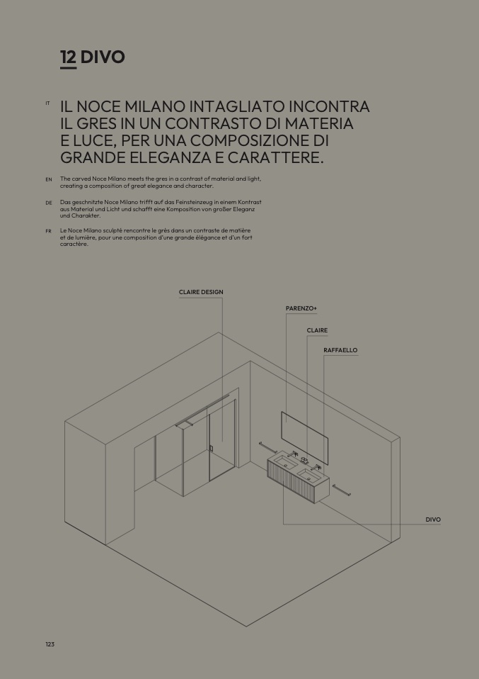 The carved Noce Milano meets the gres in a contrast of material and light,