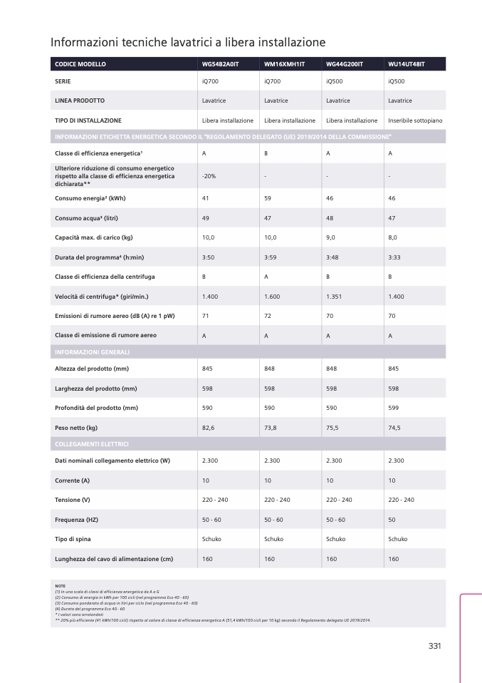 ** 20% più efficiente (41 kWh/100 cicli) rispetto al valore di classe di efficienza energetica A (51,4 kWh/100 cicli per 10 kg) secondo il Regolamento delegato UE 2019/2014.
