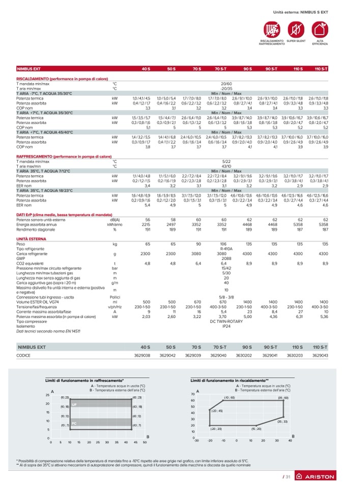 ** Al di sopra dei 35°C si attivano meccanismi di autoprotezione del compressore, quindi il funzionamento della macchina si discosta da quello nominale