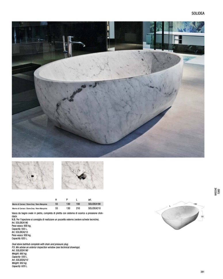Vasca da bagno ovale in pietra, completa di piletta con sistema di scarico a pressione click-