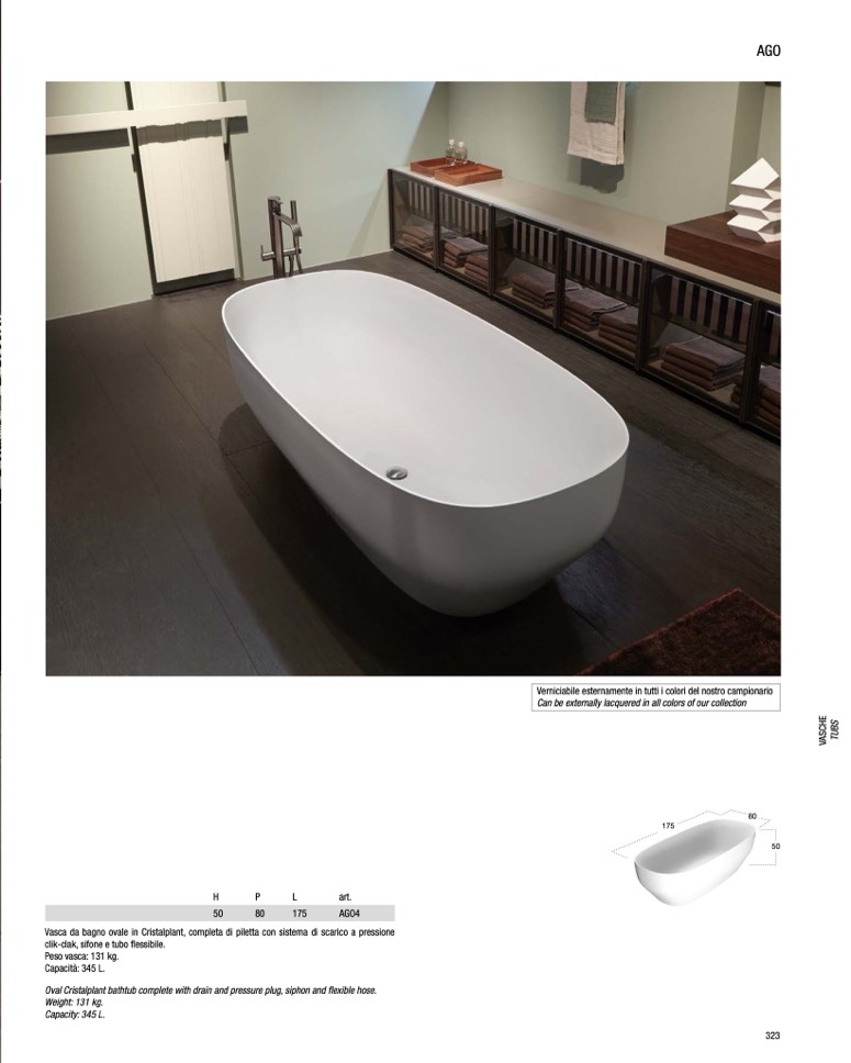 Vasca da bagno ovale in Cristalplant, completa di piletta con sistema di scarico a pressione