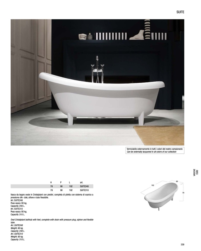 Oval Cristalplant bathtub with feet, complete with drain with pressure plug, siphon and flexible