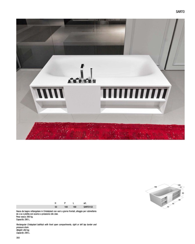 Rectangular Cristaplant bathtub with front open compartments, right or left tap border and