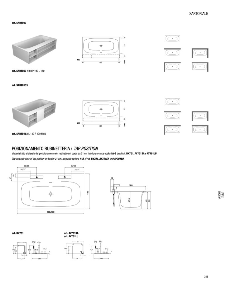 Vista dall’alto e laterale del posizionamento del rubinetto sul bordo da 21 cm lato lungo vasca opzioni A-B degli Art. BK701, AY701SA e AY701LU.