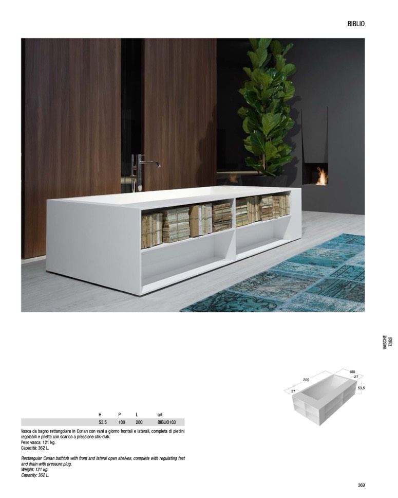 Vasca da bagno rettangolare in Corian con vani a giorno frontali e laterali, completa di piedini