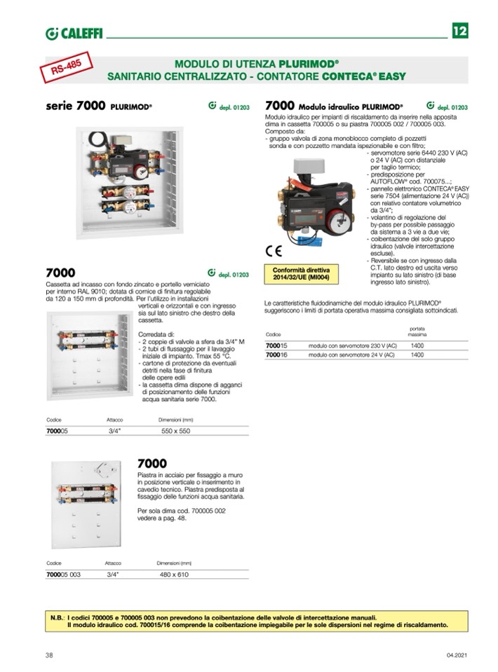 N.B.: I codici 700005 e 700005 003 non prevedono la coibentazione delle valvole di intercettazione manuali.