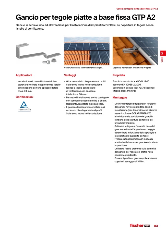 Gancio in acciaio inox ad altezza fissa per l‘installazione di impianti fotovoltaici su coperture in tegole senza
