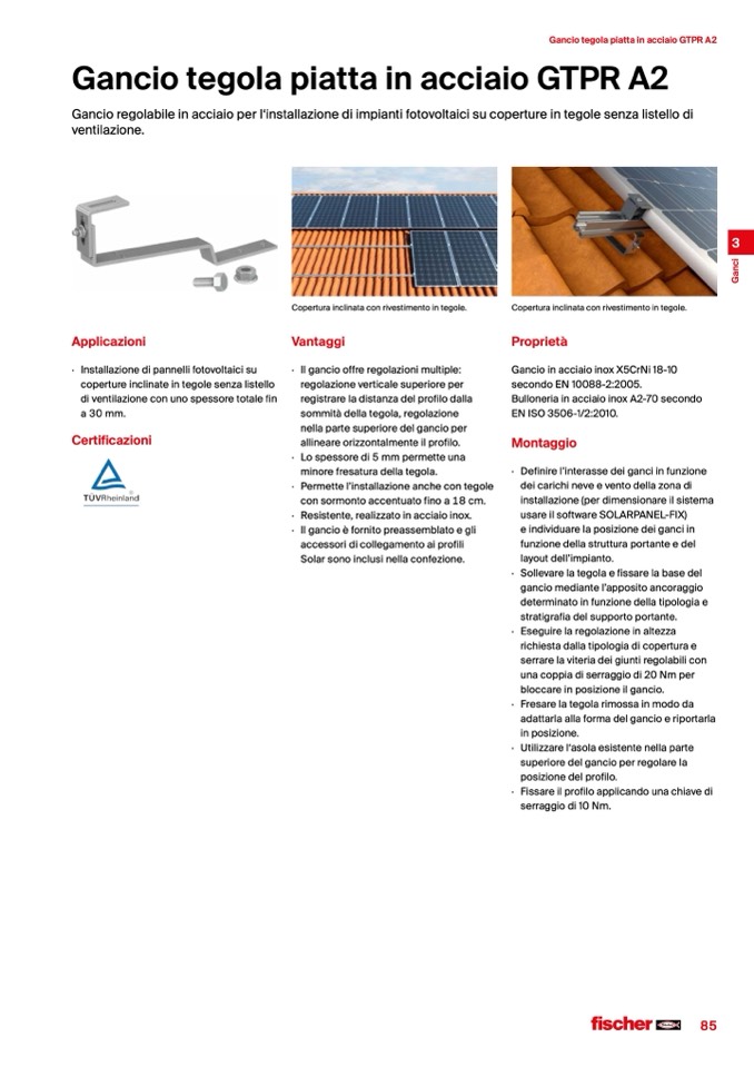 Gancio regolabile in acciaio per l‘installazione di impianti fotovoltaici su coperture in tegole senza listello di
