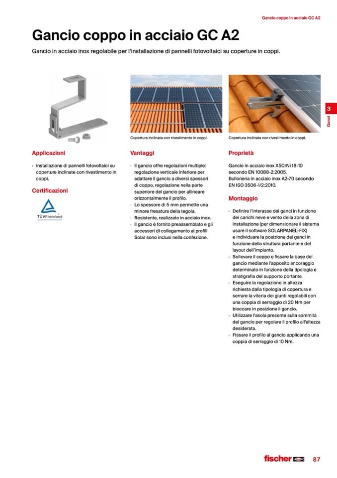 Gancio in acciaio inox regolabile per l‘installazione di pannelli fotovoltaici su coperture in coppi.