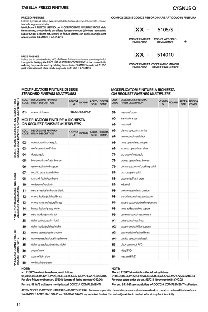 WARNING! 13-NATURAL BRASS and 88-SISAL BRASS: unprotected finishes that naturally oxidise in contact with atmospheric humidity.