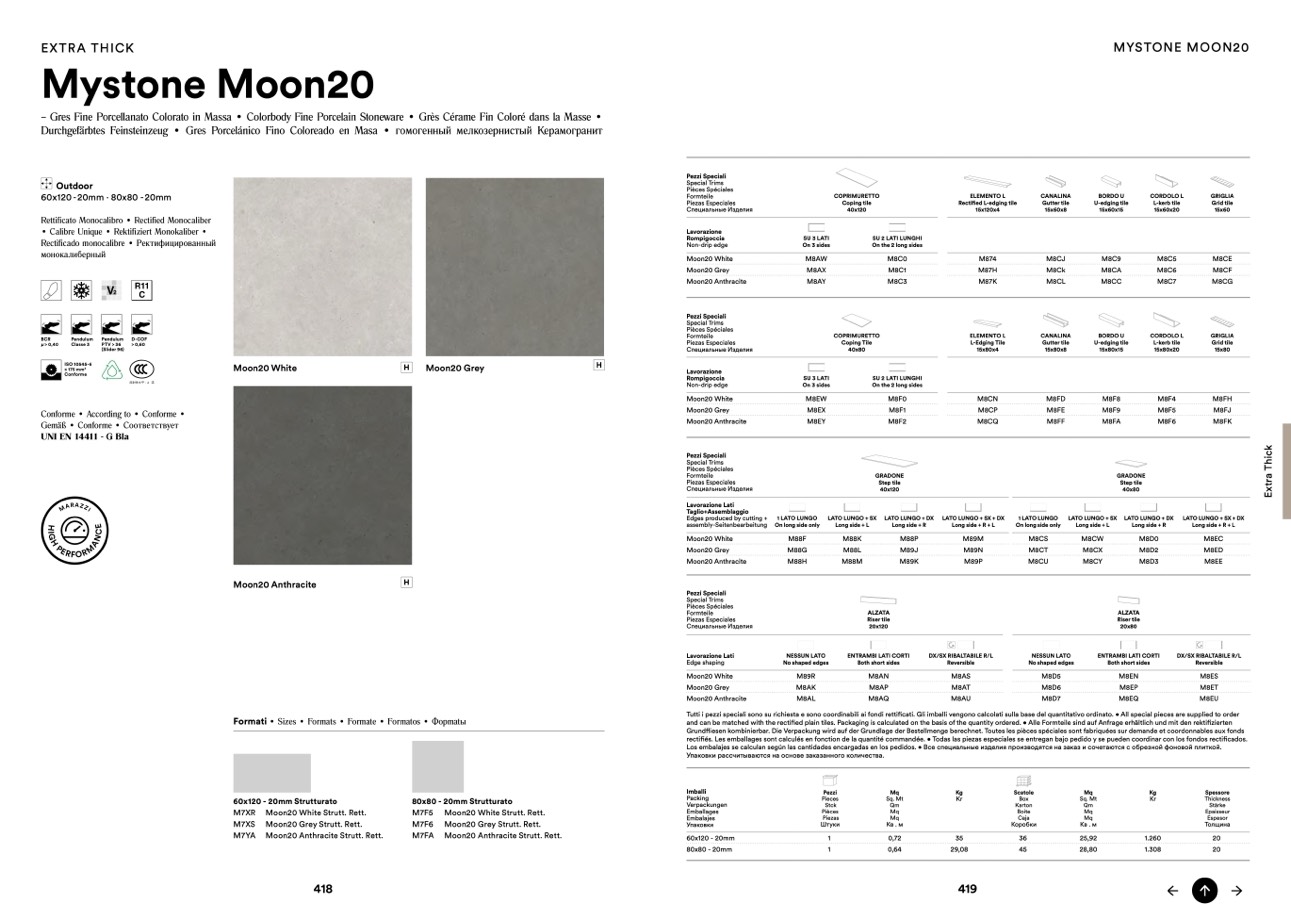 Tutti i pezzi speciali sono su richiesta e sono coordinabili ai fondi rettificati. Gli imballi vengono calcolati sulla base del quantitativo ordinato. • All special pieces are supplied to order