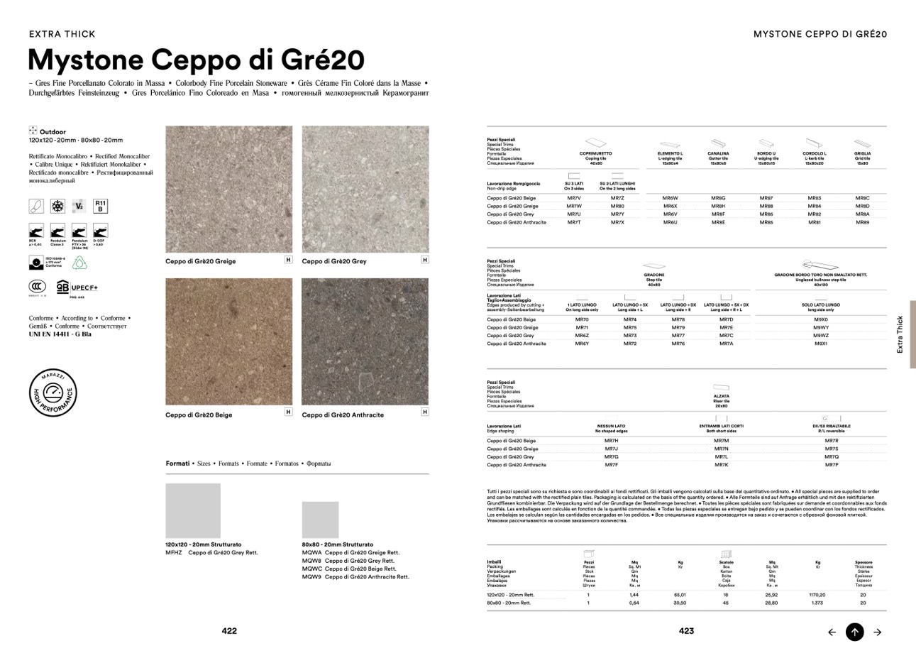 Tutti i pezzi speciali sono su richiesta e sono coordinabili ai fondi rettificati. Gli imballi vengono calcolati sulla base del quantitativo ordinato. • All special pieces are supplied to order