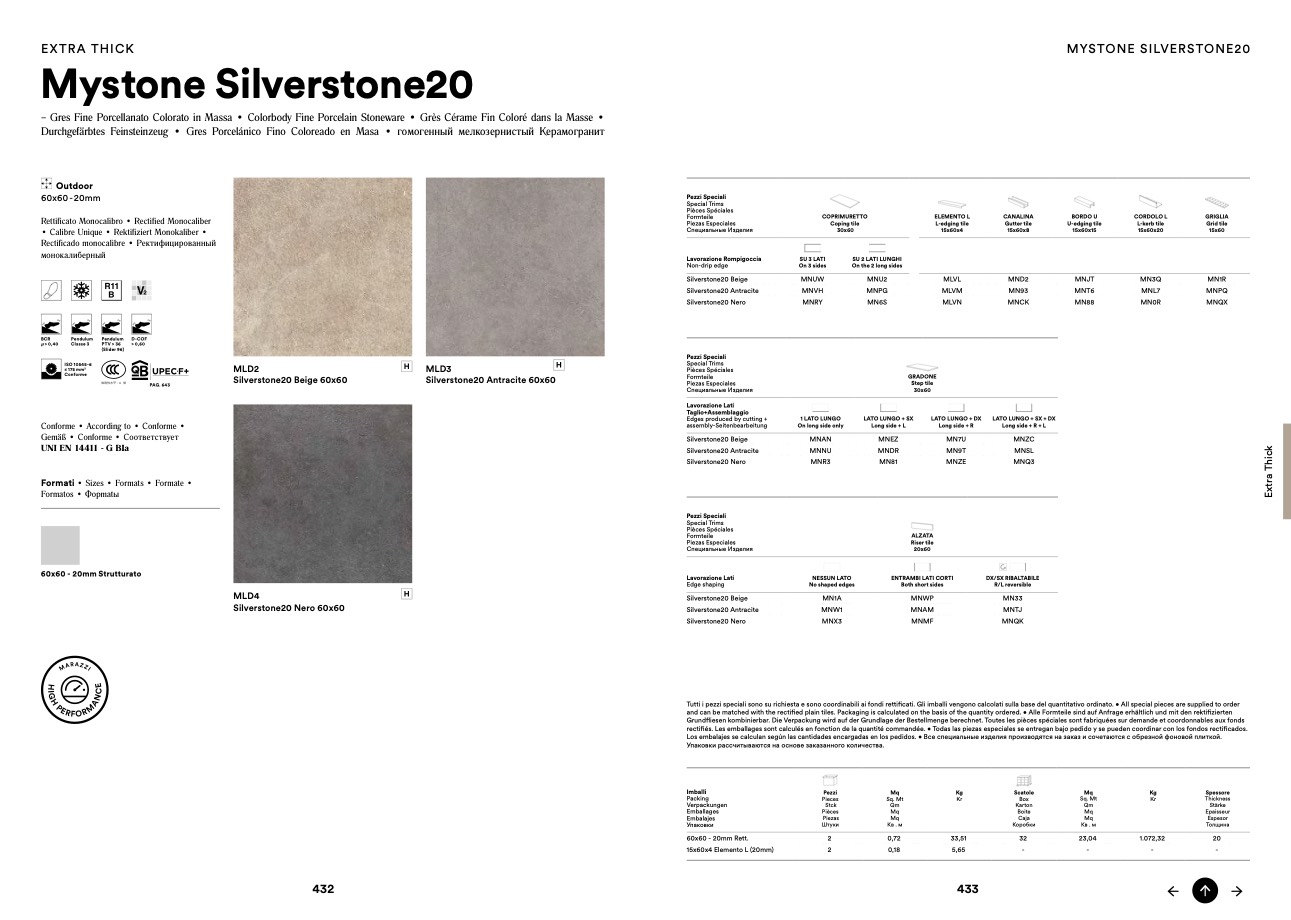 Tutti i pezzi speciali sono su richiesta e sono coordinabili ai fondi rettificati. Gli imballi vengono calcolati sulla base del quantitativo ordinato. • All special pieces are supplied to order