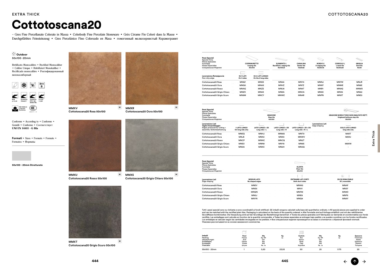 Tutti i pezzi speciali sono su richiesta e sono coordinabili ai fondi rettificati. Gli imballi vengono calcolati sulla base del quantitativo ordinato. • All special pieces are supplied to order