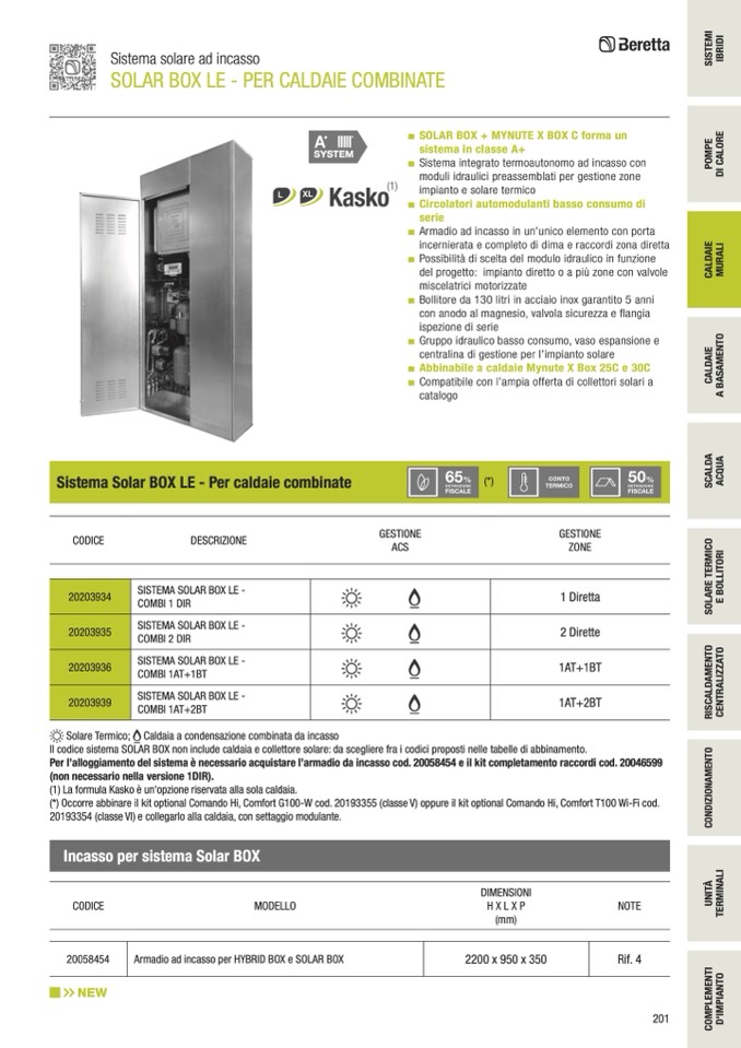 Il codice sistema SOLAR BOX non include caldaia e collettore solare: da scegliere fra i codici proposti nelle tabelle di abbinamento.