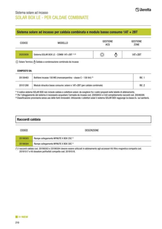 Il codice sistema SOLAR BOX non include caldaia e collettore solare: da scegliere fra i codici proposti nelle tabelle di abbinamento.