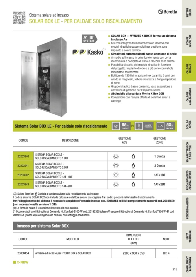 Il codice sistema SOLAR BOX non include caldaia e collettore solare: da scegliere fra i codici proposti nelle tabelle di abbinamento.