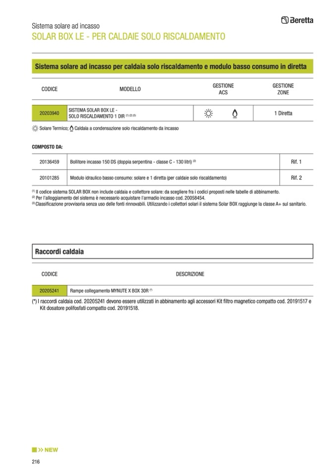 Il codice sistema SOLAR BOX non include caldaia e collettore solare: da scegliere fra i codici proposti nelle tabelle di abbinamento.