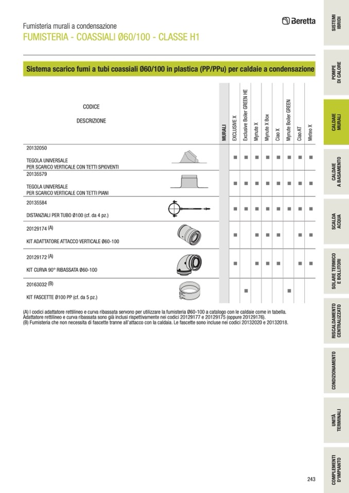 (A) I codici adattatore rettilineo e curva ribassata servono per utilizzare la fumisteria Ø60-100 a catalogo con le caldaie come in tabella.