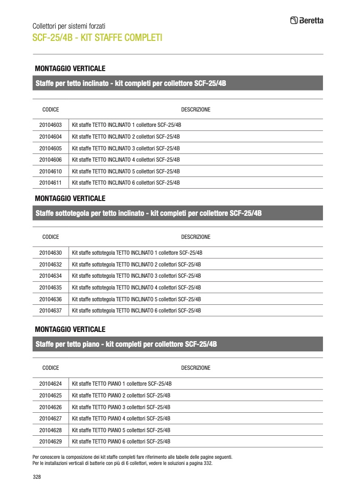 Per conoscere la composizione dei kit staffe completi fare riferimento alle tabelle delle pagine seguenti.