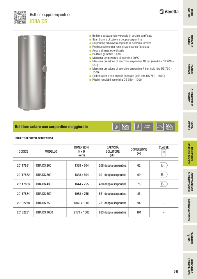 Massima pressione di esercizio serpentine 10 bar (solo Idra DS 200 ÷