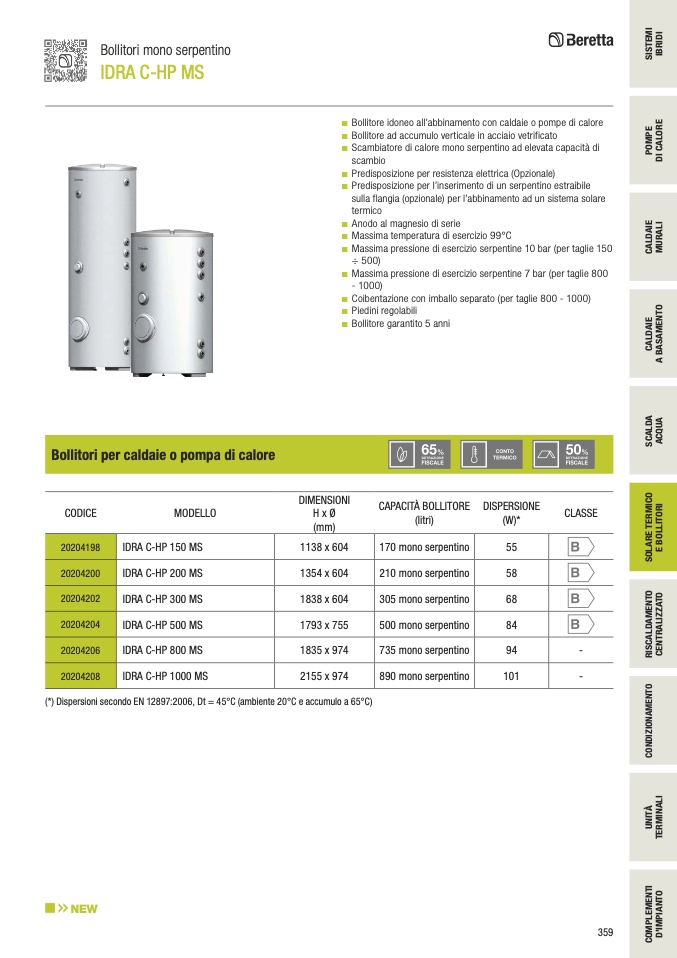 (*) Dispersioni secondo EN 12897:2006, Dt = 45°C (ambiente 20°C e accumulo a 65°C)