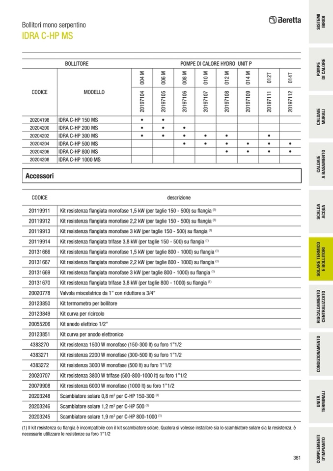 (1) Il kit resistenza su flangia è incompatibile con il kit scambiatore solare. Qualora si volesse installare sia lo scambiatore solare sia la resistenza, è