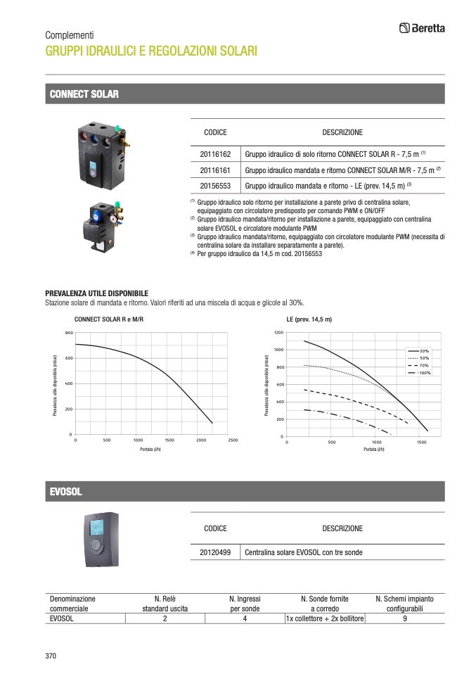 Stazione solare di mandata e ritorno. Valori riferiti ad una miscela di acqua e glicole al 30%.
