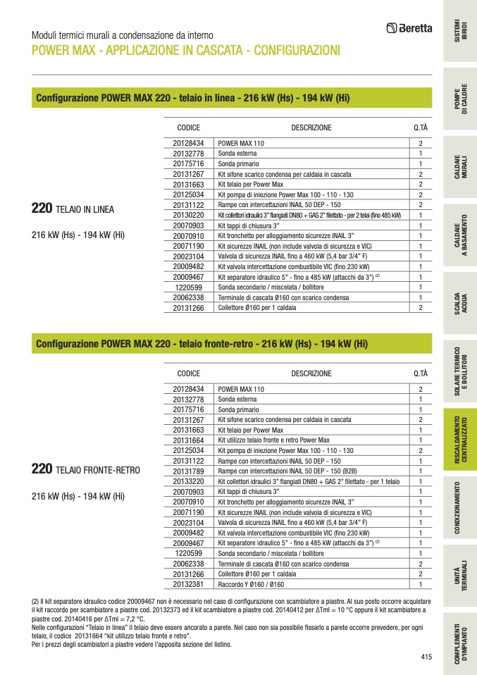 (2) Il kit separatore idraulico codice 20009467 non è necessario nel caso di configurazione con scambiatore a piastre. Al suo posto occorre acquistare