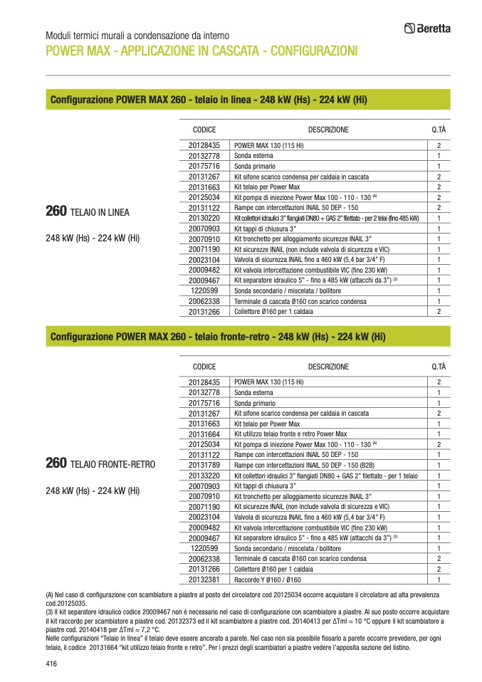 (A) Nel caso di configurazione con scambiatore a piastre al posto del circolatore cod 20125034 occorre acquistare il circolatore ad alta prevalenza