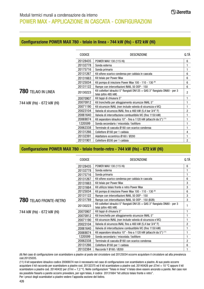 (A) Nel caso di configurazione con scambiatore a piastre al posto del circolatore cod 20125034 occorre acquistare il circolatore ad alta prevalenza