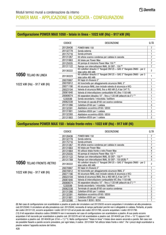 (B) Nel caso di configurazione con scambiatore a piastre al posto del circolatore cod 20125035 occorre acquistare il circolatore ad alta prevalenza