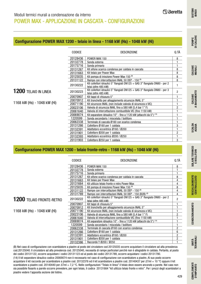 (B) Nel caso di configurazione con scambiatore a piastre al posto del circolatore cod 20125035 occorre acquistare il circolatore ad alta prevalenza