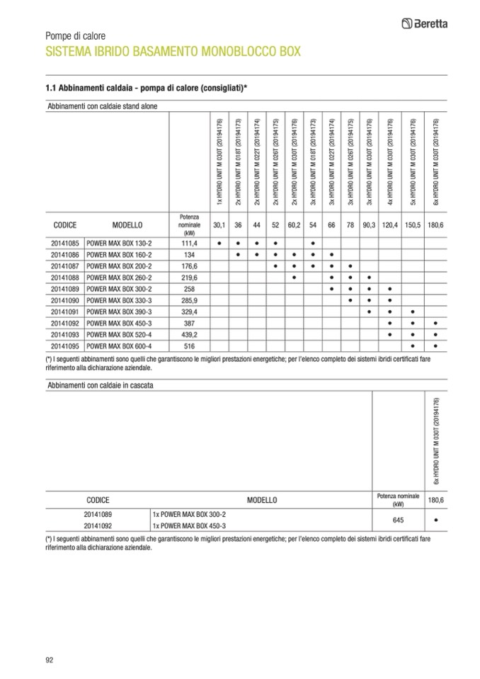 (*) I seguenti abbinamenti sono quelli che garantiscono le migliori prestazioni energetiche; per