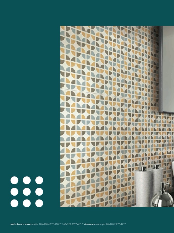 wall: decoro waves matte 120x280 471/4”x1101/4” / 60x120 235/8”x471/4” cinnamon matte ptv 60x120 235/8”x471/4”