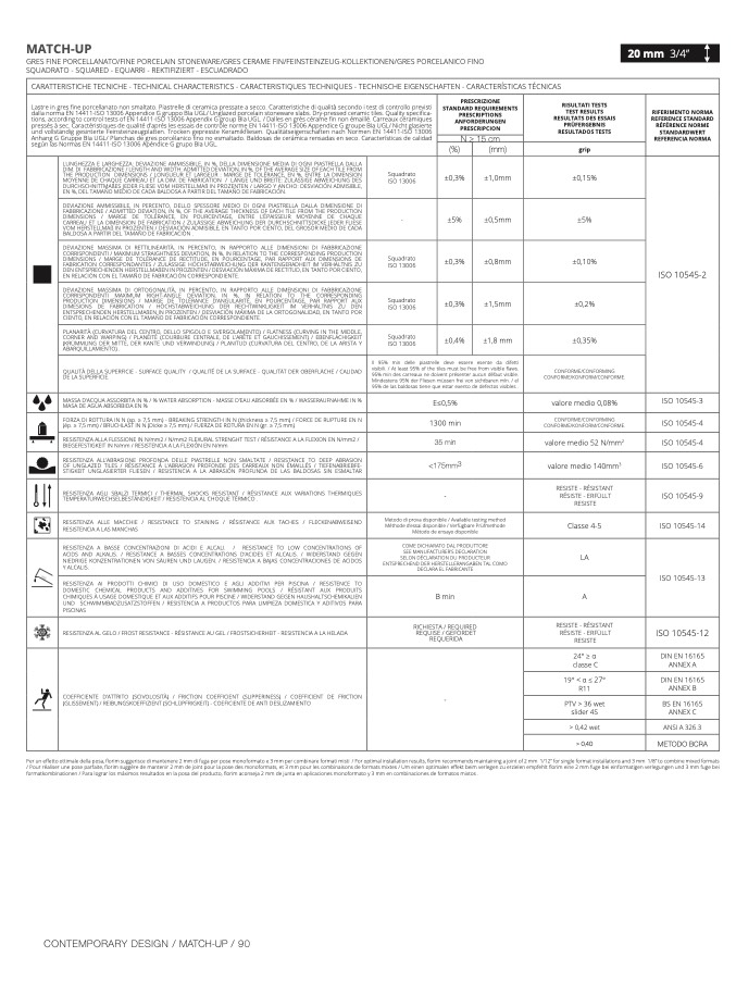 Lastre in gres fine porcellanato non smaltato. Piastrelle di ceramica pressate a secco. Caratteristiche di qualità secondo i test di controllo previst