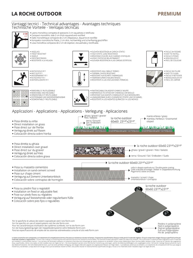 d’eau superficielles, même si les dalles ont été installées dans les règles de l’art. / Die Keramikplatten werden einer thermischen Verdichtung unterzogen, welche die Widerstandsfähigkeit und Langlebigkeit sichert. Die extrem niedrige Wasseraufnahme macht