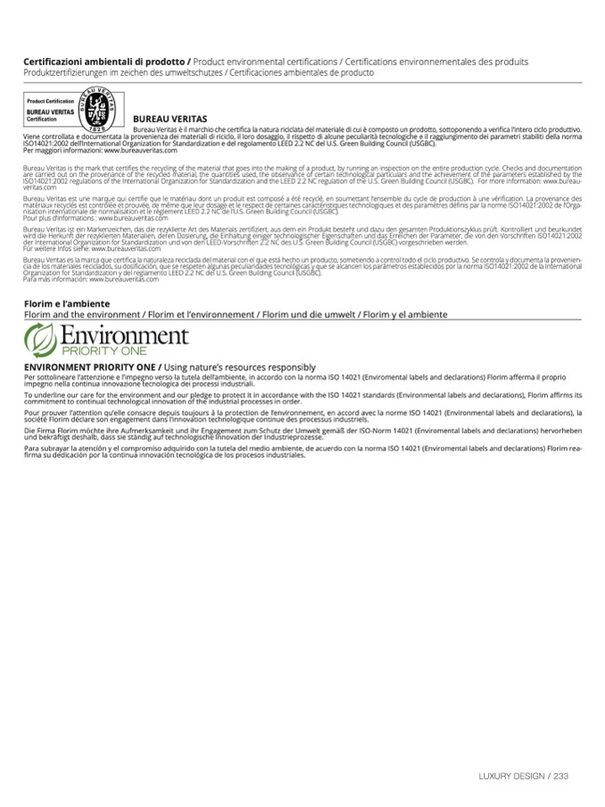 Die Firma Florim möchte ihre Aufmerksamkeit und ihr Engagement zum Schutz der Umwelt gemäß der ISO-Norm 14021 (Enviromental labels and declarations) hervorhebe
