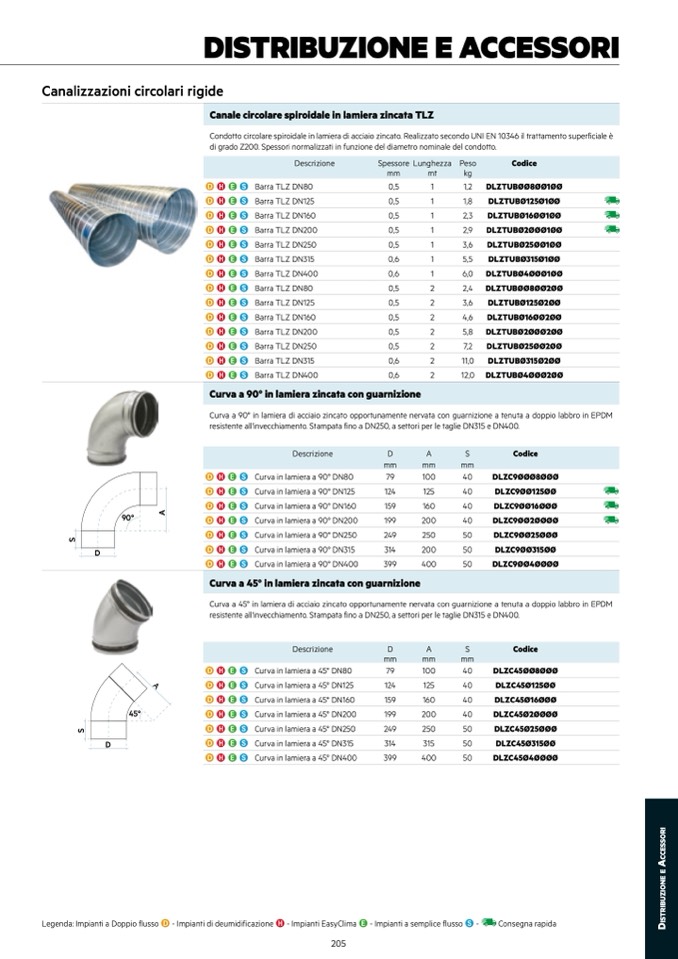 Curva a 45° in lamiera di acciaio zincato opportunamente nervata con guarnizione a tenuta a doppio labbro in EPDM