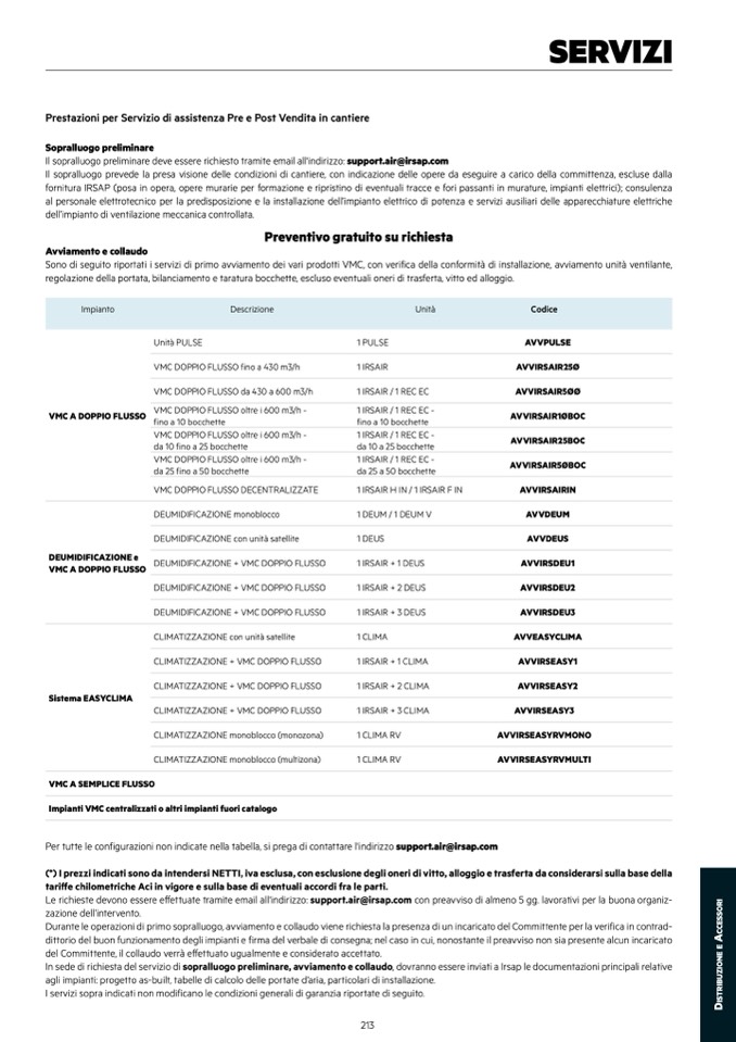 Sono di seguito riportati i servizi di primo avviamento dei vari prodotti VMC, con verifica della conformità di installazione, avviamento unità ventilante,